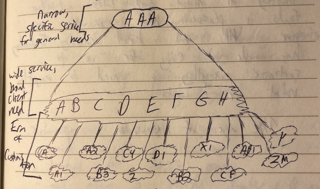 See the (poorly sketched) chart below. The top layer is the extremely narrow and custom experience we lived in as humans from the rise of the merchant class Phoenicians around 1000 BC until Sam Walton and Walmart showed up in the mid 20th century. The bottom layer is where we exist today – the era of hyper customization: