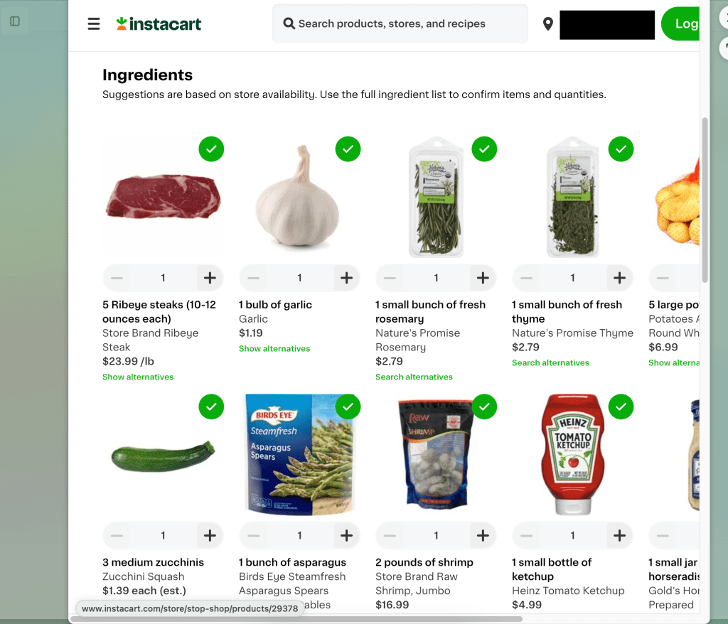 Finally, we used a special tool, kind of like a helpful add-on, called a plugin, with the online grocery shopping service, Instacart. For those who might not know, Instacart is like your personal grocery shopper. You can choose what you want from your favorite store online, and a dedicated shopper will pick and deliver them to your doorstep.