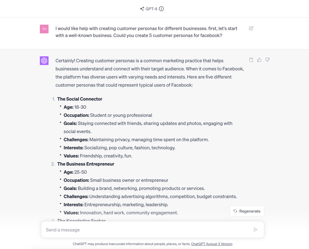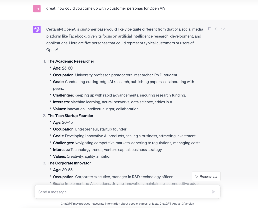 An interesting use case for these LLMs would be for a Chief Marketing Officer to develop personas of potential users of their products and platforms. We can leverage GPT to create potential users for currently existing businesses and businesses that do not yet exist.