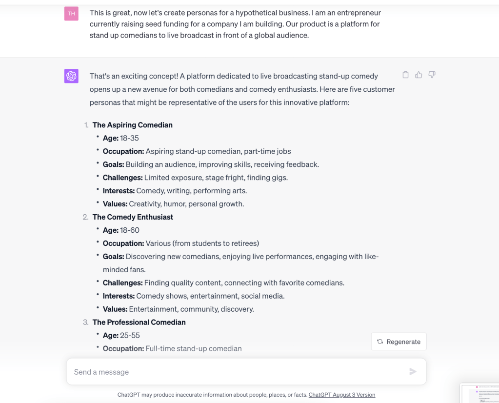 Did GPT think this deep when creating the personas? Likely not, but it brings up an interesting point on the answers being provided by GPT. There is no prior experience that this LLM has in setting up a comedy club. It didn’t just get back from the Comedy Cellar in NYC last week and has first-hand knowledge of how shows are set up. It simply relies on what other people have posted about the experience online. Sometimes having a viewpoint away from the action can present a fresh take. That is something we can all get behind.