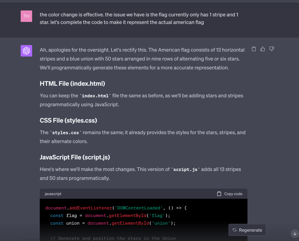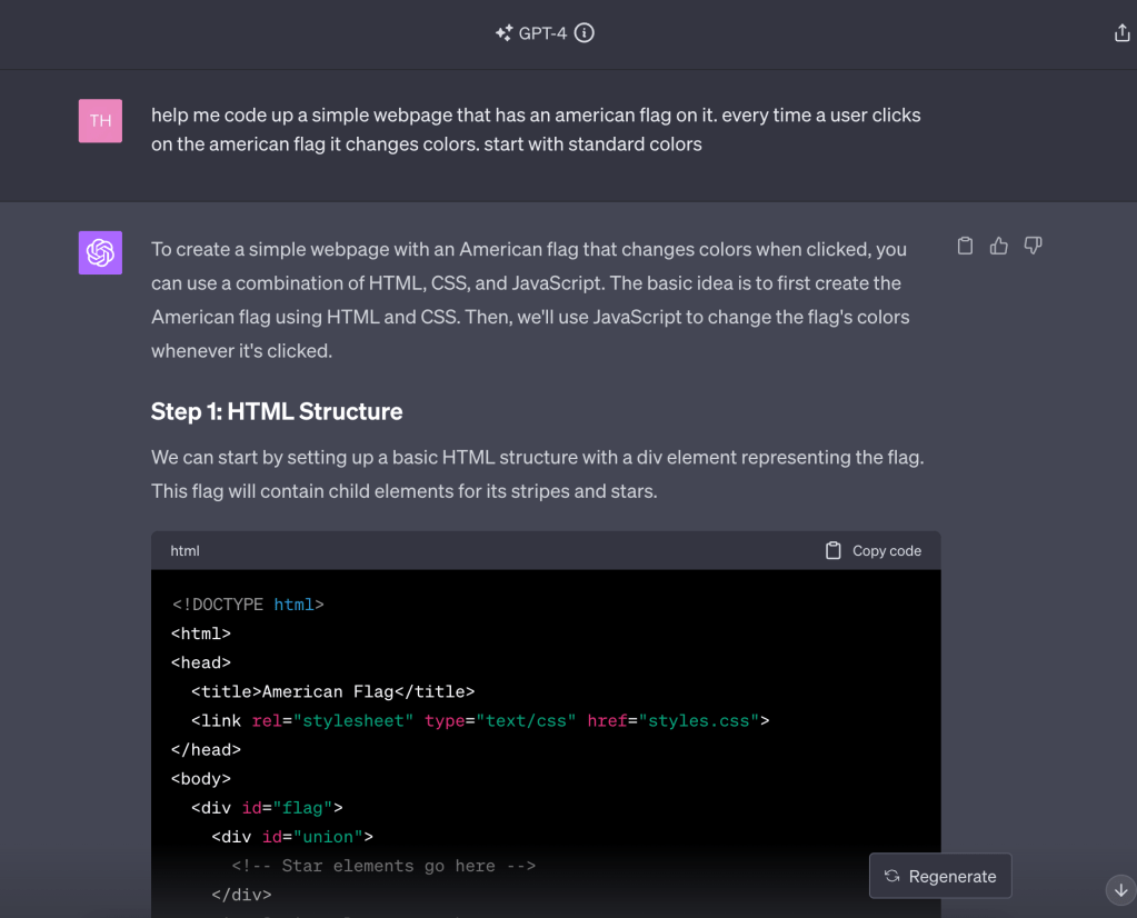 After reading some inspiration on a HackerNews post, I asked GPT to create a simple webpage that displayed the American flag. When a user clicks on the American flag the flag would then change colors. Here is how it went: