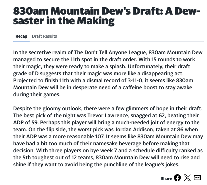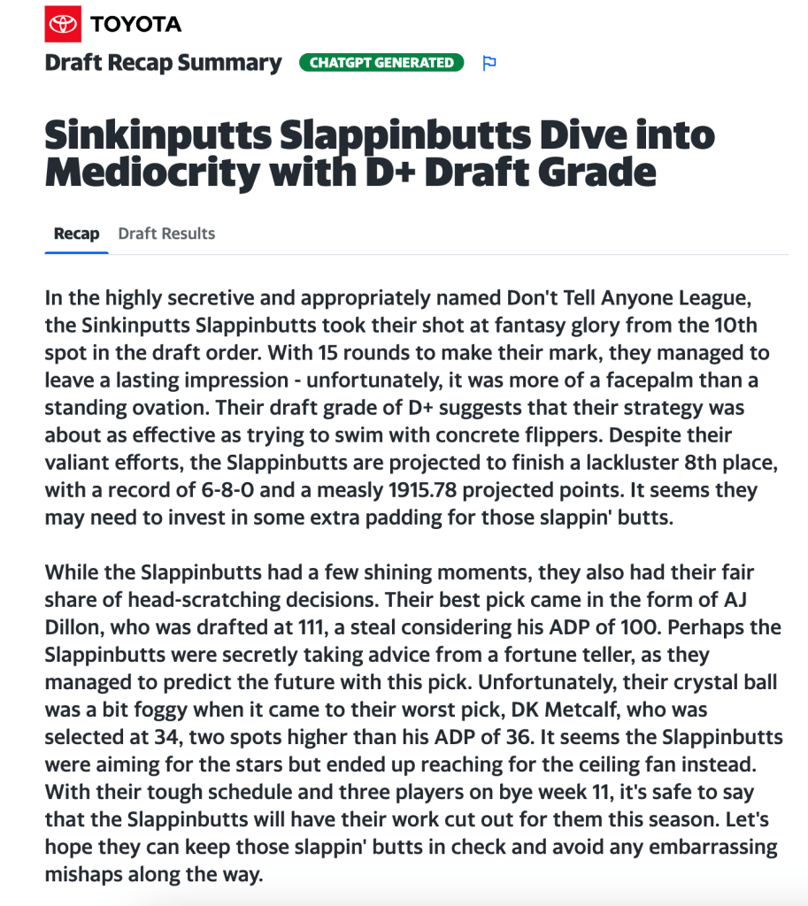 I recently had a different fantasy football draft with friends from work using Yahoo as our preferred website. After the draft, I was poking around the website and found a draft summary for each team. Not only was this provided for my team along with rankings, but every team was given a draft recap based on Yahoo’s opinion on how their draft went. I’ve included a couple screenshots of different team recaps below. As you will notice, it does get somewhat repetitive with the analysis. On the plus side, it seems very natural to have a recap for each fantasy team post-draft and all of the points did make sense with no glaring errors. This is the integration into pre-existing products we have been looking for. Rather than being a stand-alone product that hadn’t existed before, this GPT integration displays a nice add-on piece to an incumbent in the fantasy football platform industry (if you can call it that). No human analyst can spend the time making millions of unique summaries about teams in such a short period of time. Even if there were enough resources lined up to make this possible, it simply doesn’t contribute much more than an “oh that’s pretty neat” reaction to a summary that is read at most 1 time ever. Currently the most practical use cases seem to be ones we wouldn’t even expect to be powered by GPT in the first place.