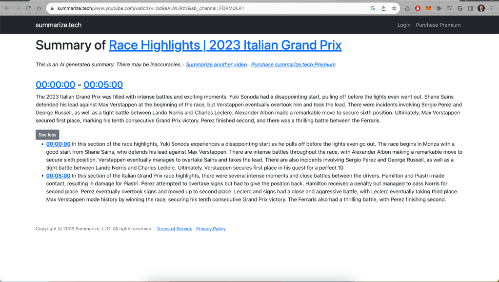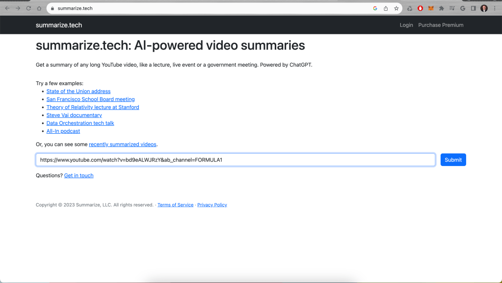 Researching today’s topic, I came across a reddit thread discussing video summaries with AI. One link was to a site called summarize.tech. It’s a pretty simple front end where users can provide a url to any Youtube video and within seconds be prompted with a written summary.