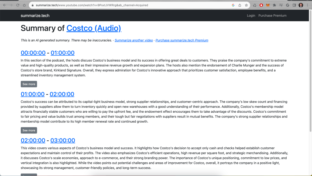 Next I wanted to try something with a bit more depth content-wise. I’ve always been a huge podcast fan. The shows in my lineup range across industry and interests: comedy, tech, markets, interviews, golf, hockey, and more. One of my favorite podcasts is Acquired. Ben Gilbert and David Rosenthal undergo deep dives on successful companies taking listeners on a 3-6 hour journey from origin of idea to modern day. An episode I recently finished was a 3 hour deep-dive into Costco Wholesale and decided this would be what we would use to check out the tool’s effectiveness on larger files: